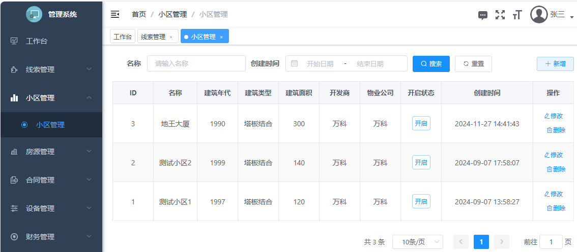 右侧下面是线索内容:有名称、建筑年代、建筑类型、建筑面积、开发商、物业公司等信息。
