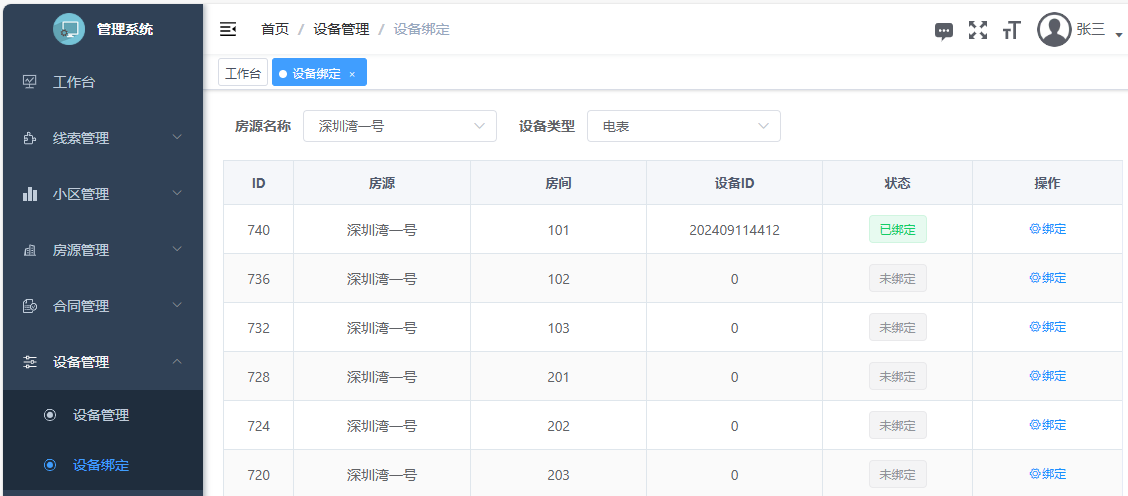 绑定电表、水表等设备ID后,智能设备自动把读数同步到系统,减少了人工操作。 可根据房源、设备类型搜索