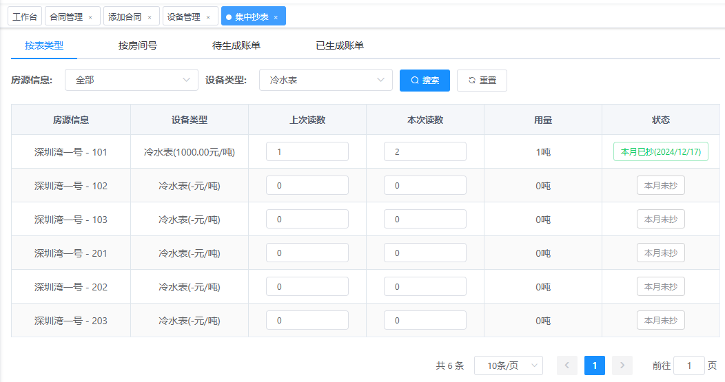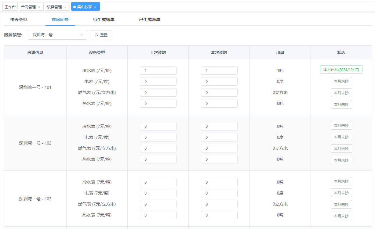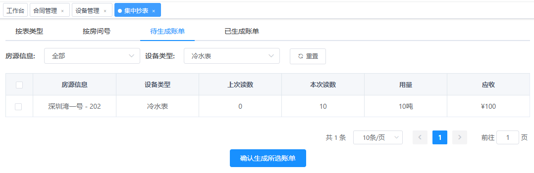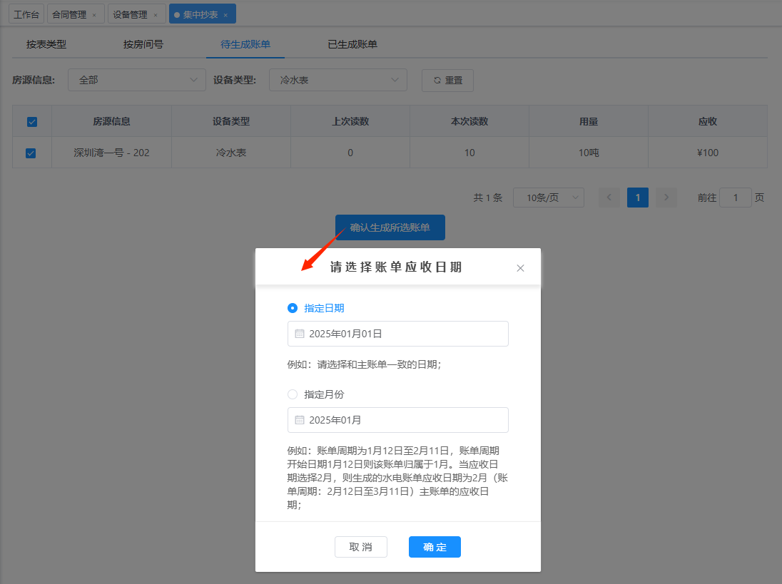 点击集中抄表按钮,弹出如下窗口 按表类型:冷水表、电表,燃气表输入读数完成抄表。按房间号:冷水表、电表等集中在一个房间号下面,方便录入抄表数据。待生成账单为已抄表未生成的账单。 左侧勾选要生成的账单,点击确认生成所选账单按钮弹出下图。 上图“请选择账单应收日期”默认勾选指定日期,因为本月抄表,收款是下个月,直接确认提交即可。 已生成账单为待生成账单中确认生成的账单。
