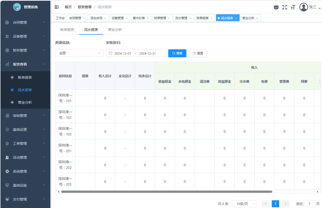 流水报表是指记录公寓运营中实际发生的收入和支出情况的报表。流水报表详细记录了每一笔交易,包括租金的收缴、各项费用的支出等,这些记录反映了公寓的实际财务状况。通过流水报表,公寓管理者可以清晰地掌握资金的流动情况,包括租客的付款情况和公寓的支出情况,从而进行更为精确的财务管理和决策1。