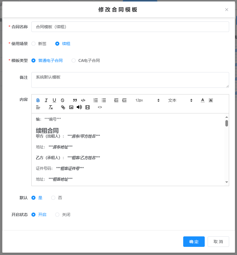 在公寓管理系统中,合同模板管理功能允许管理员或相关人员对租赁等合同模板进行一系列操作。这些操作包括但不限于: