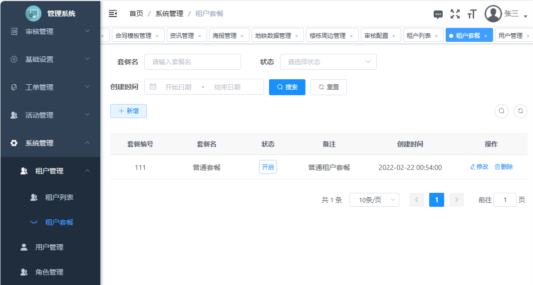 租户套餐是用来给租户设置后台菜单访问权限的,可以创建多个租户套餐分配给不同的租户。